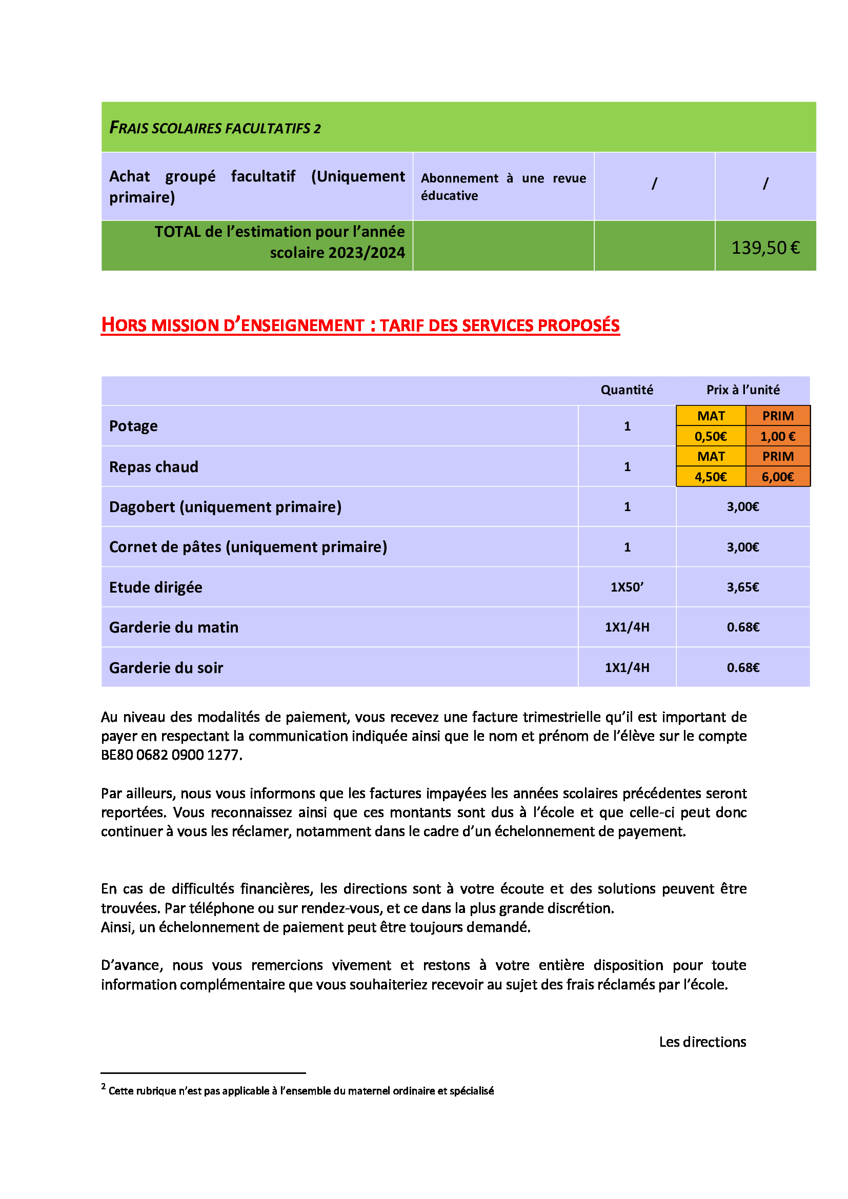 Accueil Infos pratiques Horaires Les règles de vie et absences Accueil extrascolaire Ecole des devoirs P.M.S. Frais scolaires Ephémérides Documents à télécharger Nos spécifités Graines de médiateur B.C.D. Eveil scientifique – Informatique Eveil aux langues et Néerlandais – Anglais Eveil musical Ose le vert Pro Vélo Bâtiments Notre histoire Contact Frais scolaires P1C Frais scolaires 2023-2024 Frais scolaires 2022-2023