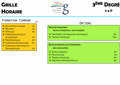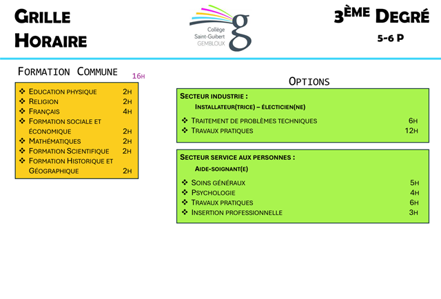 Accueil Equipe éducative Directions Chefs d’atelier Référents élèves Grilles horaires Informations pratiques Projet pédagogique Horaire et éphémérides Que faire en cas d’absence? Rôle du PMS Organisation des retenues Sortie autorisée Ressources pédagogiques Balises pour la citoyenneté – 2022-2023 Infos cafétéria Dernières nouvelles Inscriptions Contact Vers l’enseignement Qualifiant Grilles 2025-2026 1 er degré 2 ème degré Général Technique Vers l'enseignement Qualifiant Professionnel Vers l'enseignement Qualifiant 3 ème degré Général Technique Vers l'enseignement Qualifiant Professionnel Vers l'enseignement Qualifiant